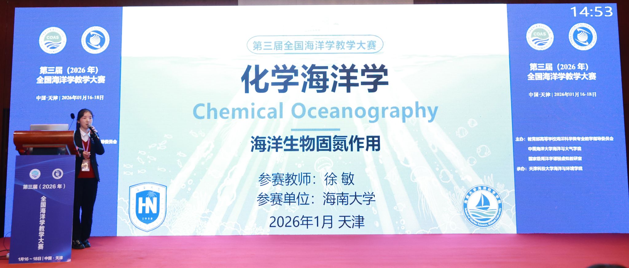 徐敏老师从事本科教学工作两年,目前承担《化学海洋学》《化学海洋学实验》以及《同位素导论》等多门海洋科学专业核心课程的教学任务。此次获奖不仅是对其个人教学能力的肯定,也展现了学院在青年教师培养与本科教学质量建设上的初步成果。备赛期间,学院高度重视,专门组织教学指导,为教师参赛提供了有力支持。
