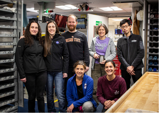 The Physical Properties laboratory group. Back row: Lara Perez Miguel (Physical Properties Specialist, British Antarctic Survey, UK), Yasmina Martos (Physical Properties/Downhole Measurements Specialist, NASA Goddard Space Flight Center, USA), Ian Bailey (Stratigraphic Correlator/Physical Properties Specialist, University of Exeter, UK), Sidney Hemming (Stratigraphic Correlator/Physical Properties Specialist, Columbia University, USA), and Xufeng Zheng (Physical Properties Specialist, Hainan University, China). Front row: Marga Garcia (Physical Properties/Downhole Measurements Specialist, University of Granada, Spain) and Michelle Guitard (Physical Properties Specialist, University of South Florida, St. Petersburg, USA). (Credit: Lee Stevens & IODP)